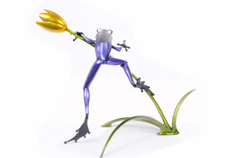 Belle Fleur BF218, 2017, Bronze, Limited Edition of 350, Signed & Numbered, 13.5 x 7.5 x 10.75 A dazzling gold nitrate tulip sways gracefully as a lavender frog climbs the stem. Belle Fleur, Frogman's 2017 flower release, clearly pays homage to Tim's very first Mother's Day sculpture.