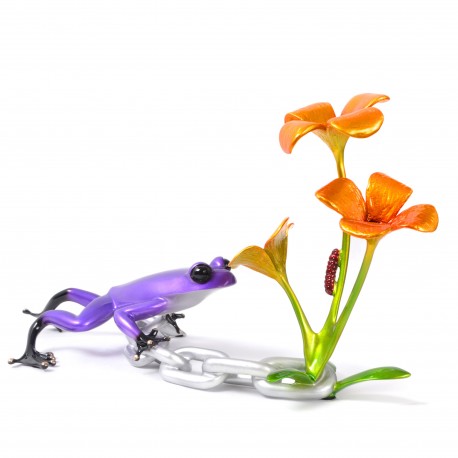 According to Wikipedia, a wildflower is a flower that grows where it was not intentionally seeded or planted, even if it is growing where it would not naturally grow. Randomly linked by a silver chain, variegated gold petals contrast beautifully with a saturated purple frog. California Gold, Tim Cotterill’s 2021 Mother’s Day sculpture, clearly exemplifies this natural phenomenon. BF253 California Gold Edition Size: 350 13" x 6" x 7.25"