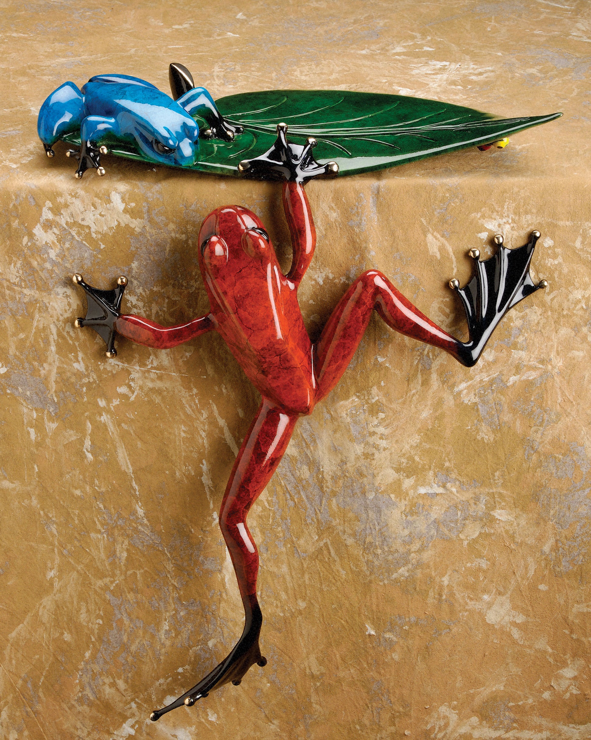 Cliffhanger BF72, 2005, Bronze, Limited Edition of 2000, Signed & Numbered, 11.5 x 7 x 13.25, Color/Finish: Red, Blue, Green This amazing double frog sculpture hangs over the edge of a table or mantelpiece.