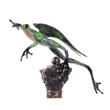 “HERMES,” the third sculpture to be released in the FROGMAN “Signature Collection,” draws inspiration from Greek mythology, architecture, and classical statuary. A mythical, winged frog, bearing the classic Frogman “old-school” patina, balances atop the capital of an archetypal Corinthian column, preparing for flight. To emphasize the significance of wings as a motif in mythology, the upper surface of the wings are highly polished to a rich, golden finish. The Corinthian-style column is offered in a choice of two options- a waxed antique brown and a speckled, stone-like waxed patina. Either patina masterfully replicates the elements and finishes associated with classical statuary. Hermes- Tim Cotterill’s homage to ancient mythology’s continued influence on modern culture. Hermes BF285 Edition Size: 50 SRP $3,290 11" x 5.5" x 16"