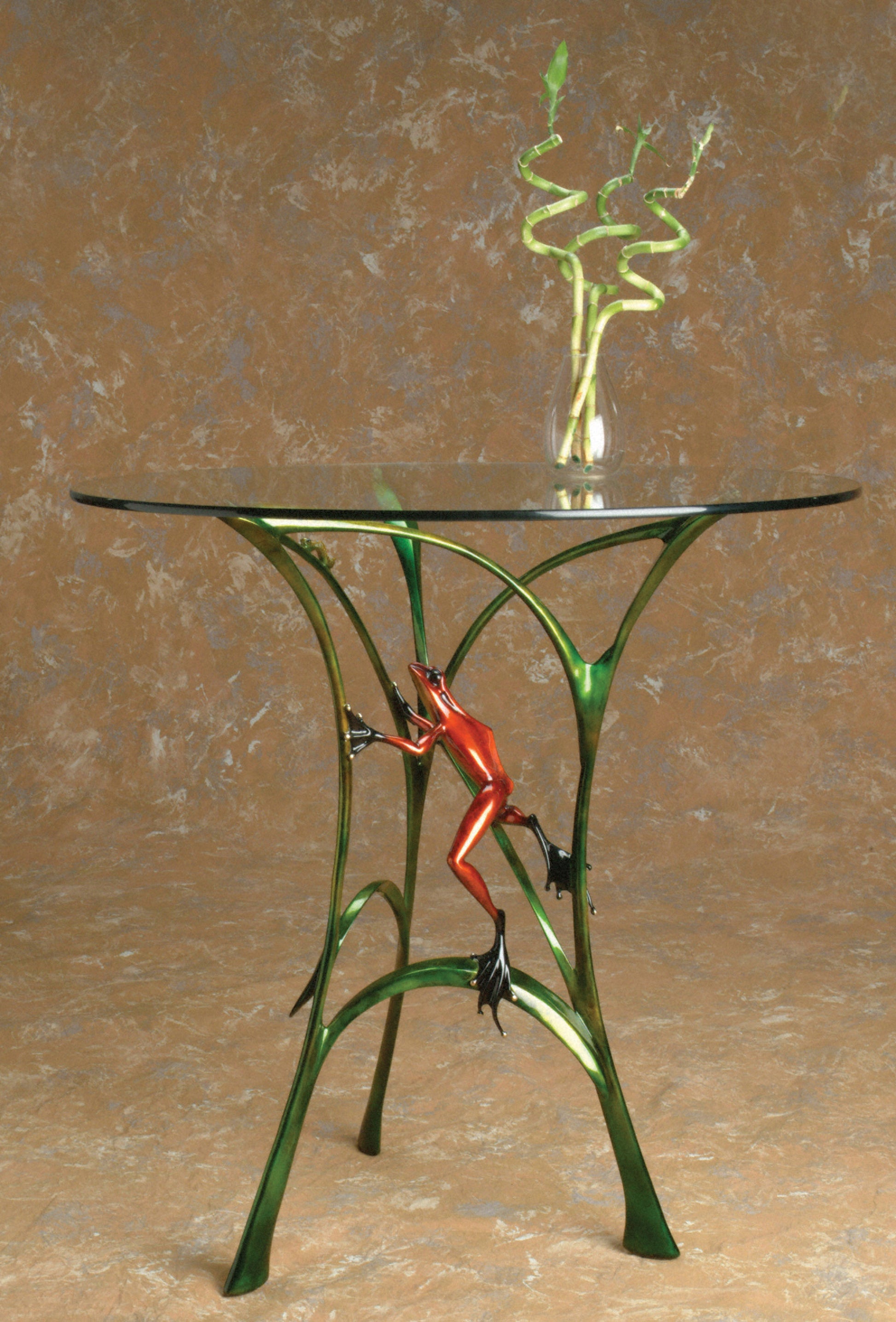 Let's do Lunch BF70, 2005, Bronze, Limited Edition of only 250, Signed & Numbered, 30" High; Base 21" Diameter; Top 24" Diameter, Material: Bronze, Color/Finish: Silver Nitrate Red & Green or choose your own patina. This table base features a large metallic red frog climbing towards his caterpillar lunch. Ideal place to display your collection of Tim's frogs.Ships without glass top.