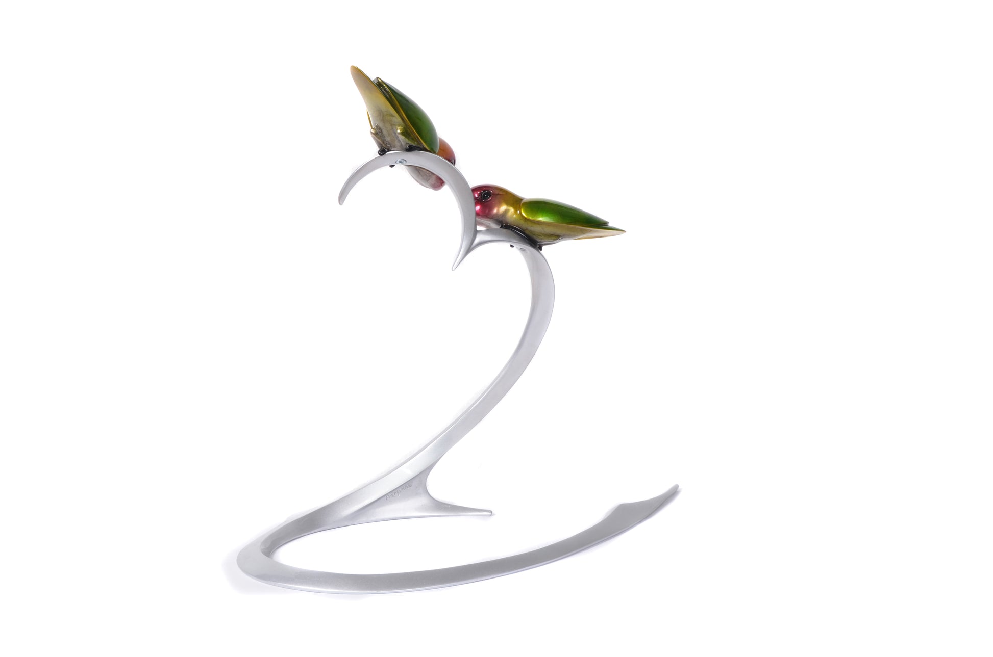 Love Birds, BF223, 2018, Bronze, Limited Edition of 200, 19"L x 10"W x 16"H Breaking with tradition, Frogman's 2018 Valentine's Sculpture features subject matter straight from the Tim Cotterill Aviary. Two colorful lovebirds perch atop a silver nitrate reed clearly enamored with each another. Lovebirds, often considered the inspiration for Valentine's Day, provide the ideal expression for this annual holiday release.