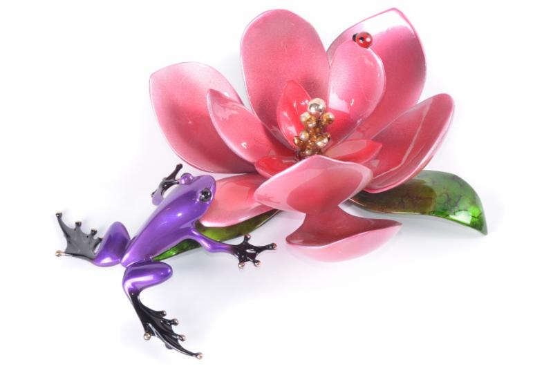 Magnolia, 2018, BF226 Bronze, Limited Edition of 350, 8.5" x 7" x 3.5" 2018 Mother's Day Release A brilliant pink blossom provides the ideal tableau for a vibrant purple frog, as he gazes intently at Tim Cotterill's iconic ladybug. Drawing inspiration from his very own lush garden, Tim Cotterill clearly pays homage to mothers everywhere with the lovely "Magnolia."