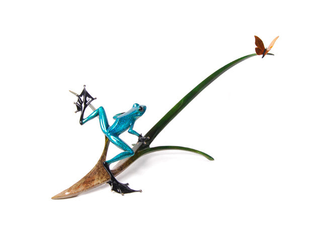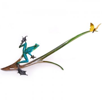 Papillon (French for Butterfly) Edition 750 14 x 27 x 16" Tim has captured the beauty of an iridescent butterfly as it alights on a slender, elegant reed where a watchful frog awaits. Papillon is a stunning centerpiece for any Frogman collection