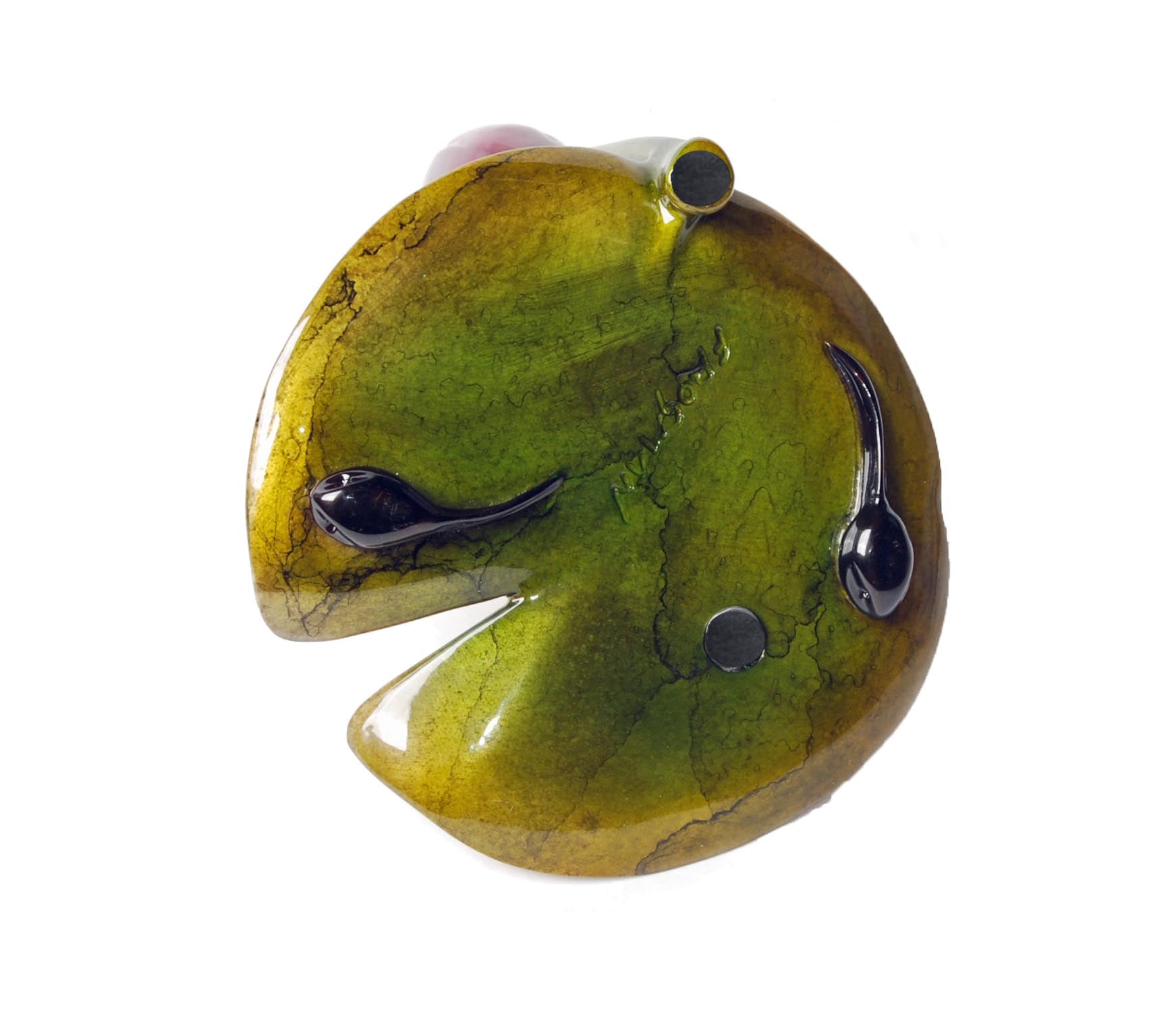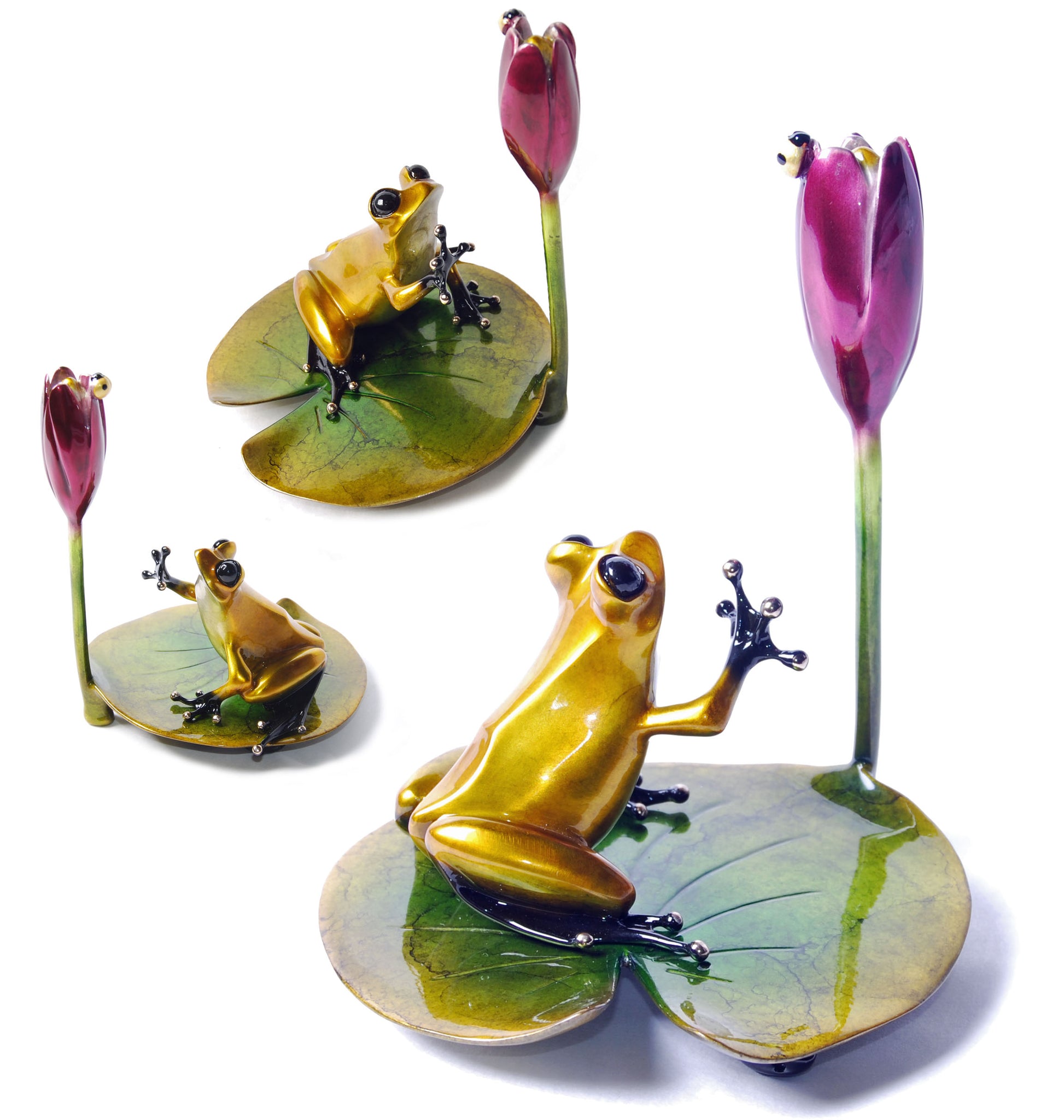 Water Lily BF155 - 2011, Bronze, Limited Edition of 2000, Signed & Numbered, 5.75 x 4.75 x 4.75, color/Finish: Gold, Green, Rose A golden frog sitting on a lily pad reaches for a ladyb ug resting on top of a water lily.